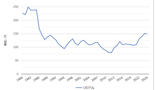 (下記図表はUSドル/円の為替レートの推移(1980~2025年) – 世界経済のネタ帳から)